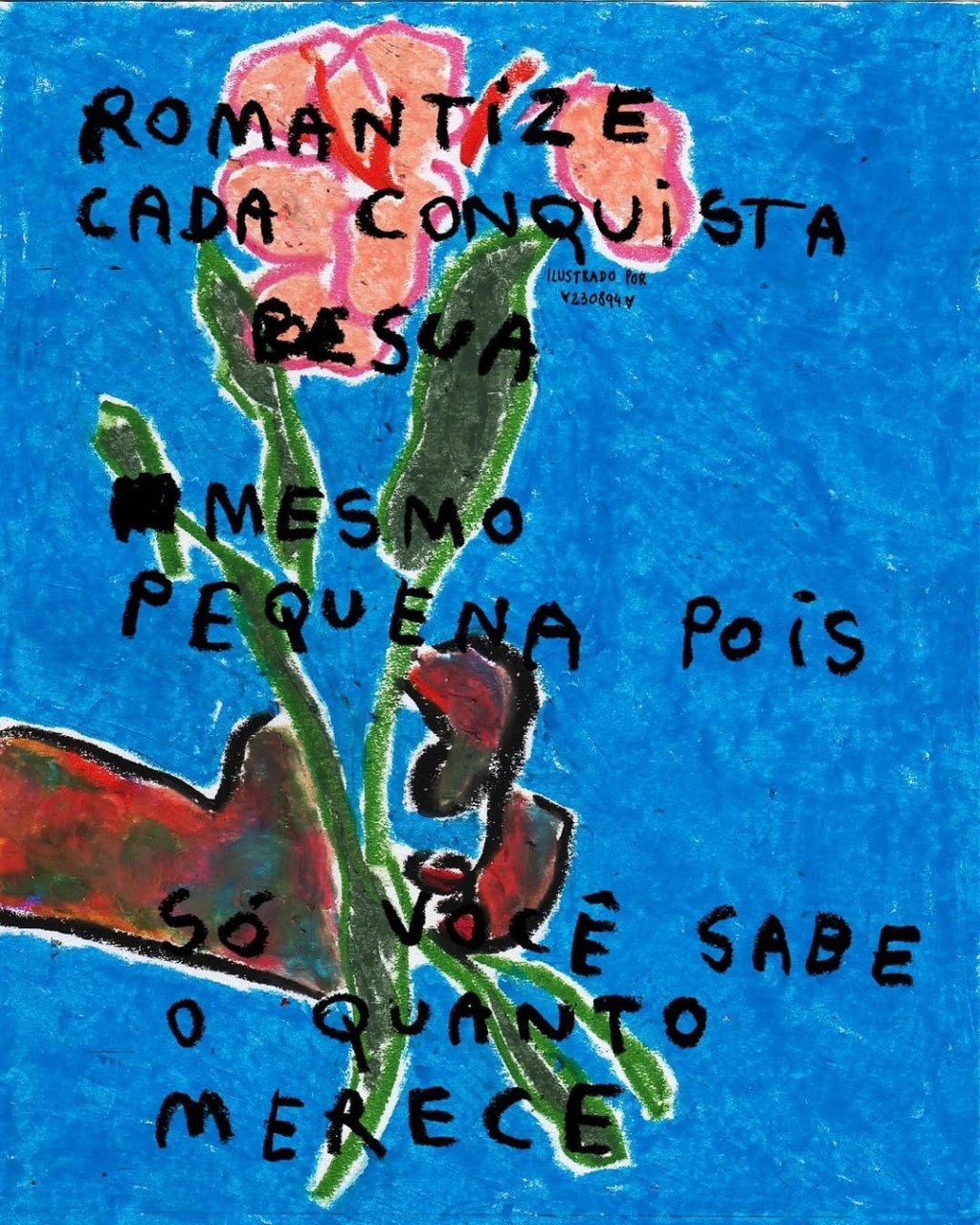 O contorno cego (ou blind contour) e o uso de frases são os pilares de seu trabalho. Carol, no entanto, não se limita a essas técnicas. O verdadeiro fundamento de sua arte é o olhar profundo sobre os sentimentos, dando voz à sensibilidade humana em seu ofício.